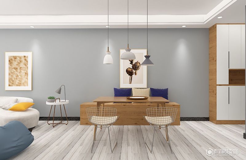 戶型的客廳與餐廳一體,中間區(qū)域如何過(guò)渡設(shè)計(jì)?廈門(mén)裝潢裝飾設(shè)計(jì)建議通過(guò)改變地面材質(zhì),用于區(qū)分客廳和餐廳空間。假如客廳是木地板,餐廳就換成瓷磚或石材。這樣做的目的,是讓兩個(gè)空間在視覺(jué)上有一定的區(qū)分,日常生活中的使用頻次高。