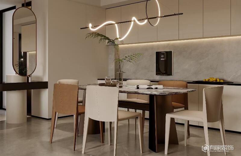 餐廳質(zhì)感提升實(shí)用攻略?注重餐廳家具和裝飾品的材質(zhì)選擇,如天然木材、石材、金屬等。這些材質(zhì)不僅質(zhì)感優(yōu)良,還能提升餐廳的整體品質(zhì)感。關(guān)注餐廳的細(xì)節(jié)處理,如餐桌邊角的打磨、餐椅靠背的舒適度等。通過(guò)色彩、材質(zhì)、家具等元素的呼應(yīng)和搭配,實(shí)現(xiàn)餐廳與整體家居風(fēng)格的和諧統(tǒng)一。根據(jù)個(gè)人喜好和需求,廈門(mén)裝飾設(shè)計(jì)公司進(jìn)行個(gè)性化定制,例如定制餐邊柜、餐桌椅等。
